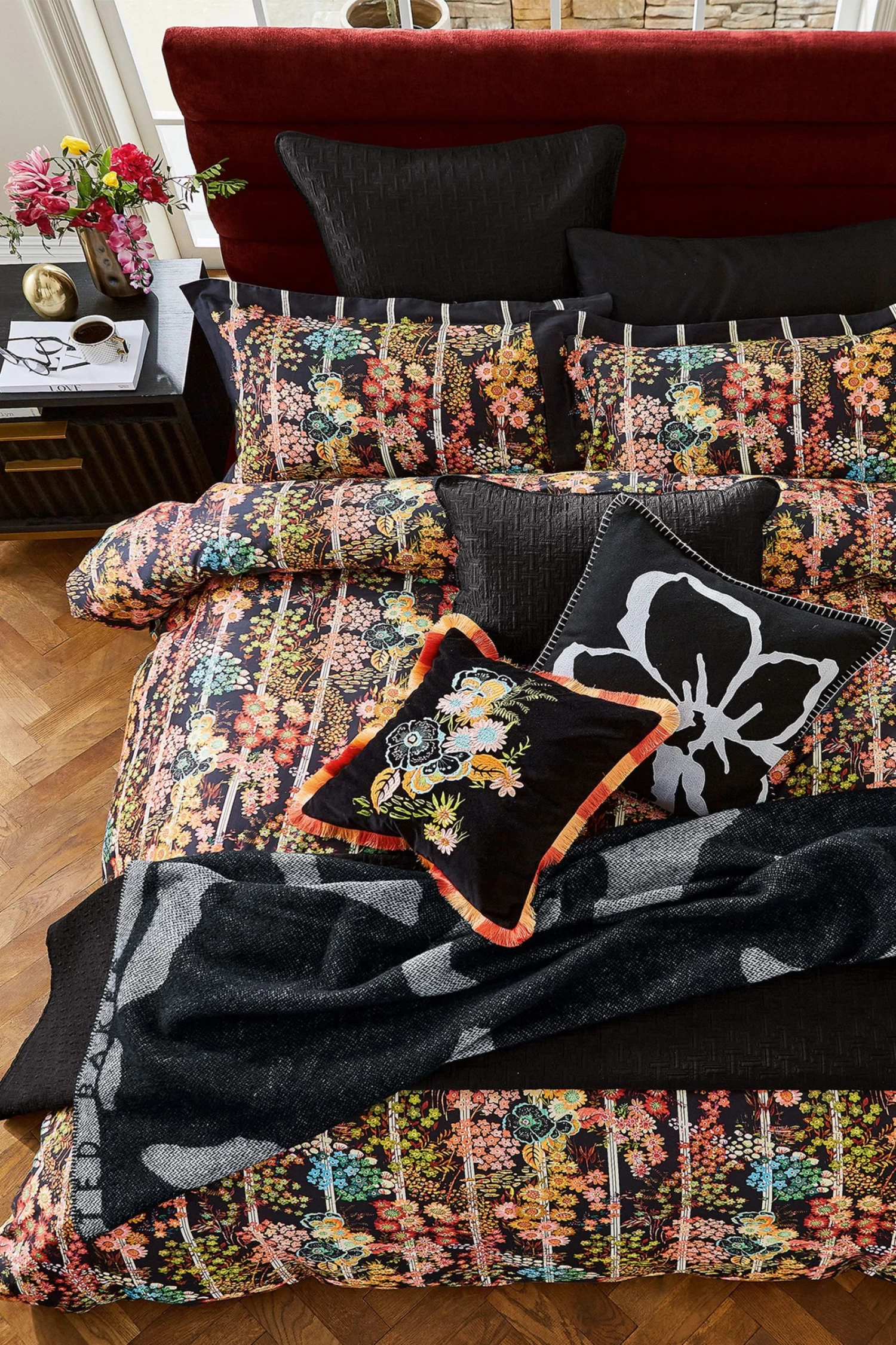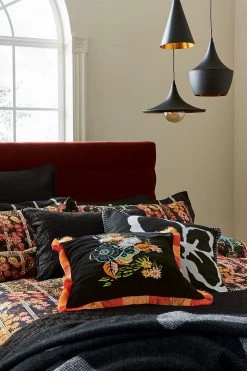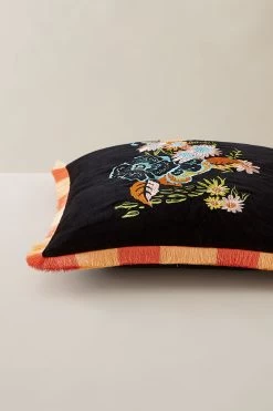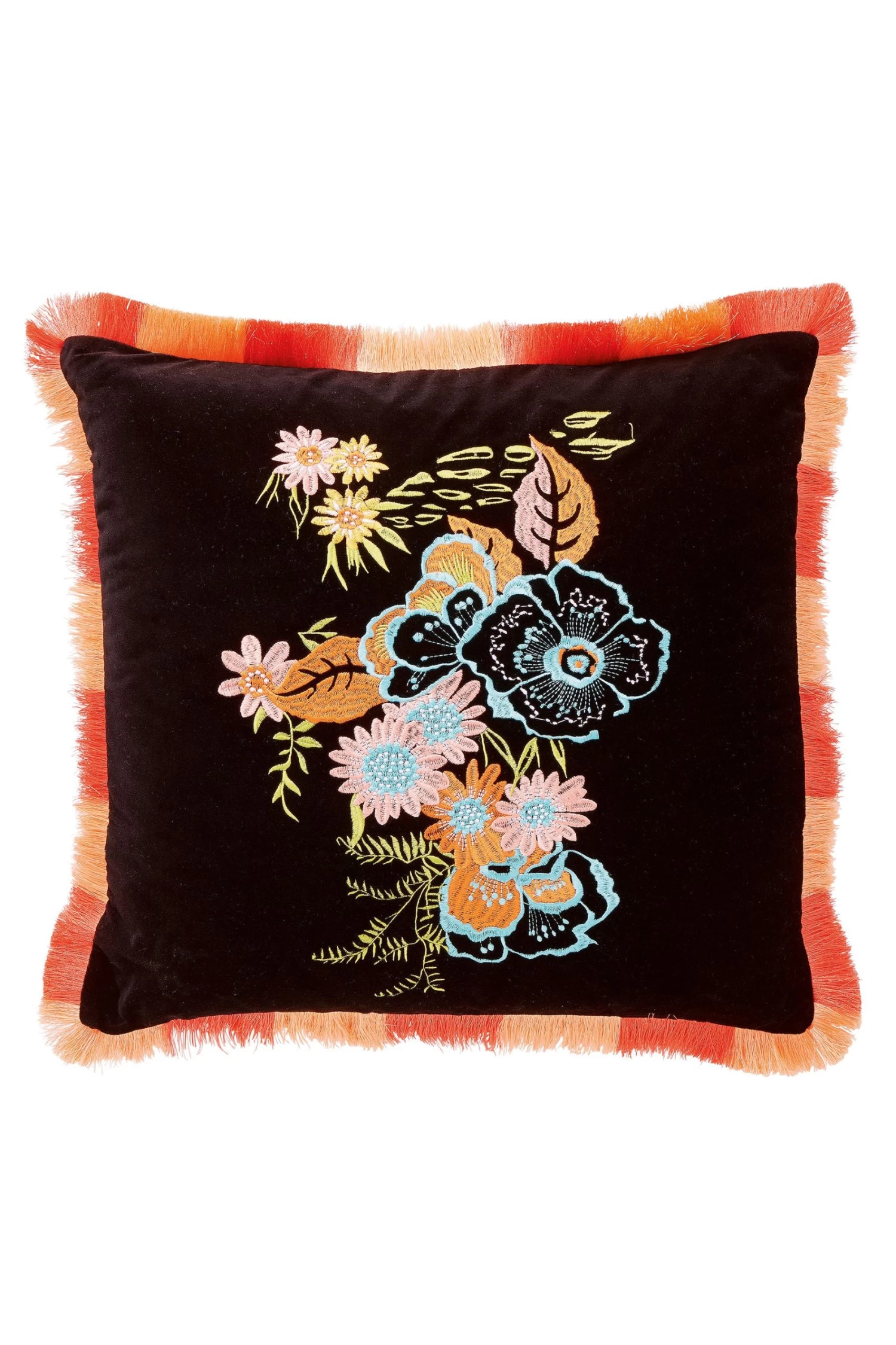 Black floral velvet cushion with embroidered detailing and pops of blue, orange and pink.