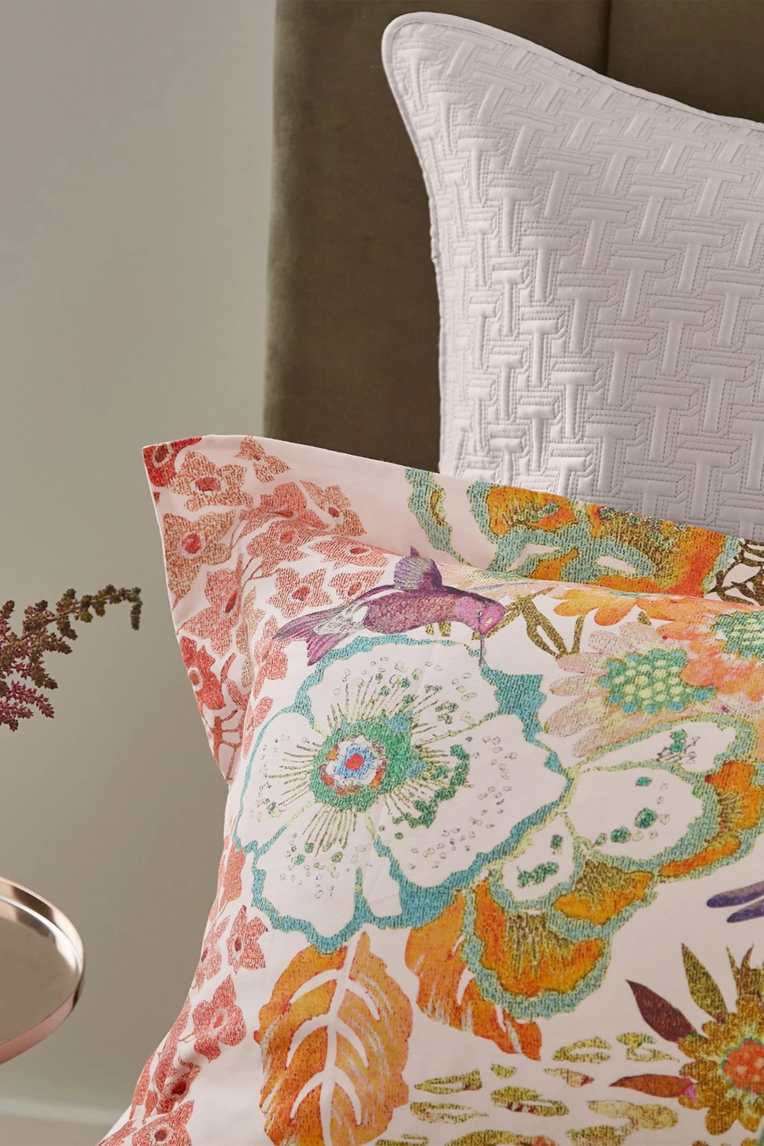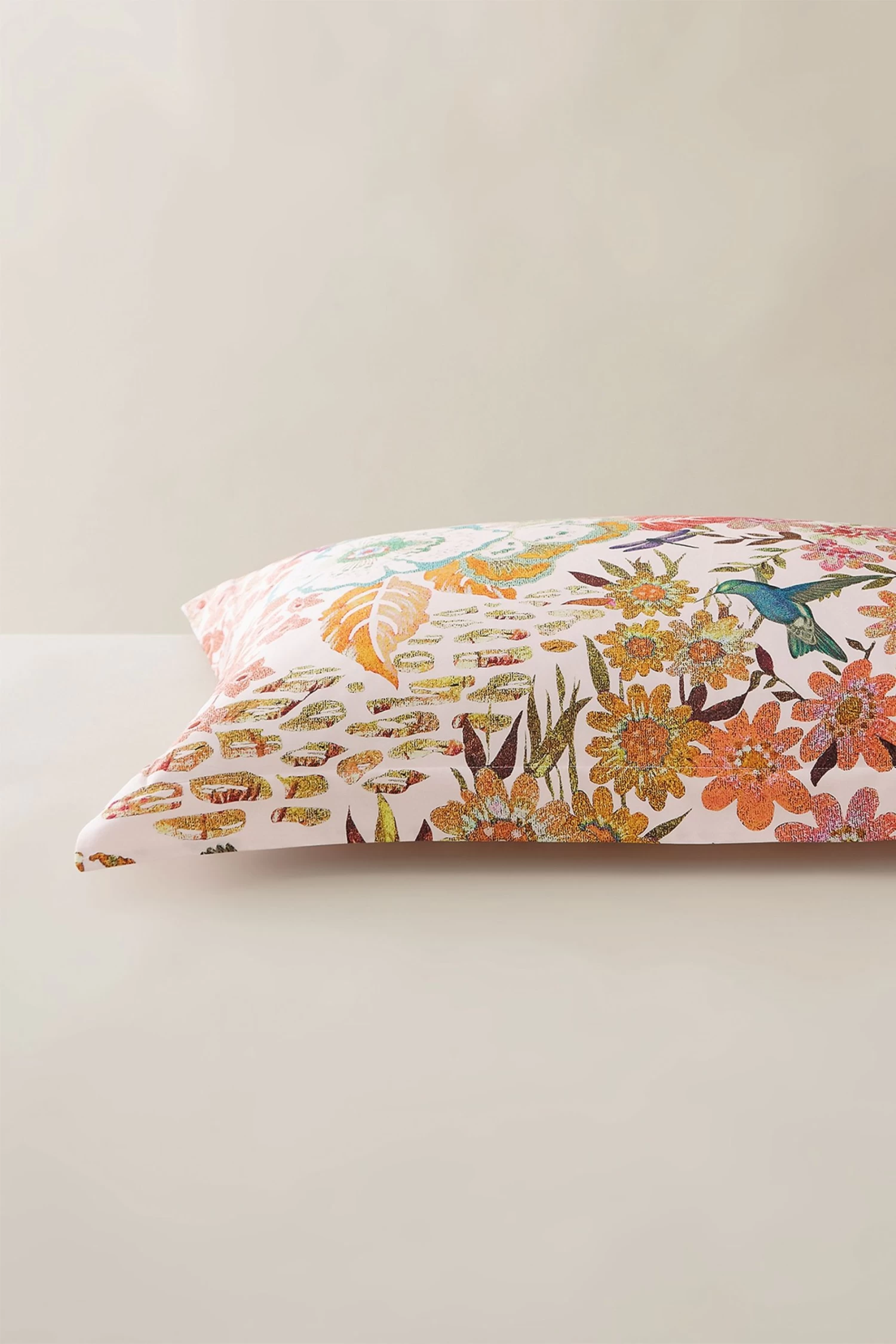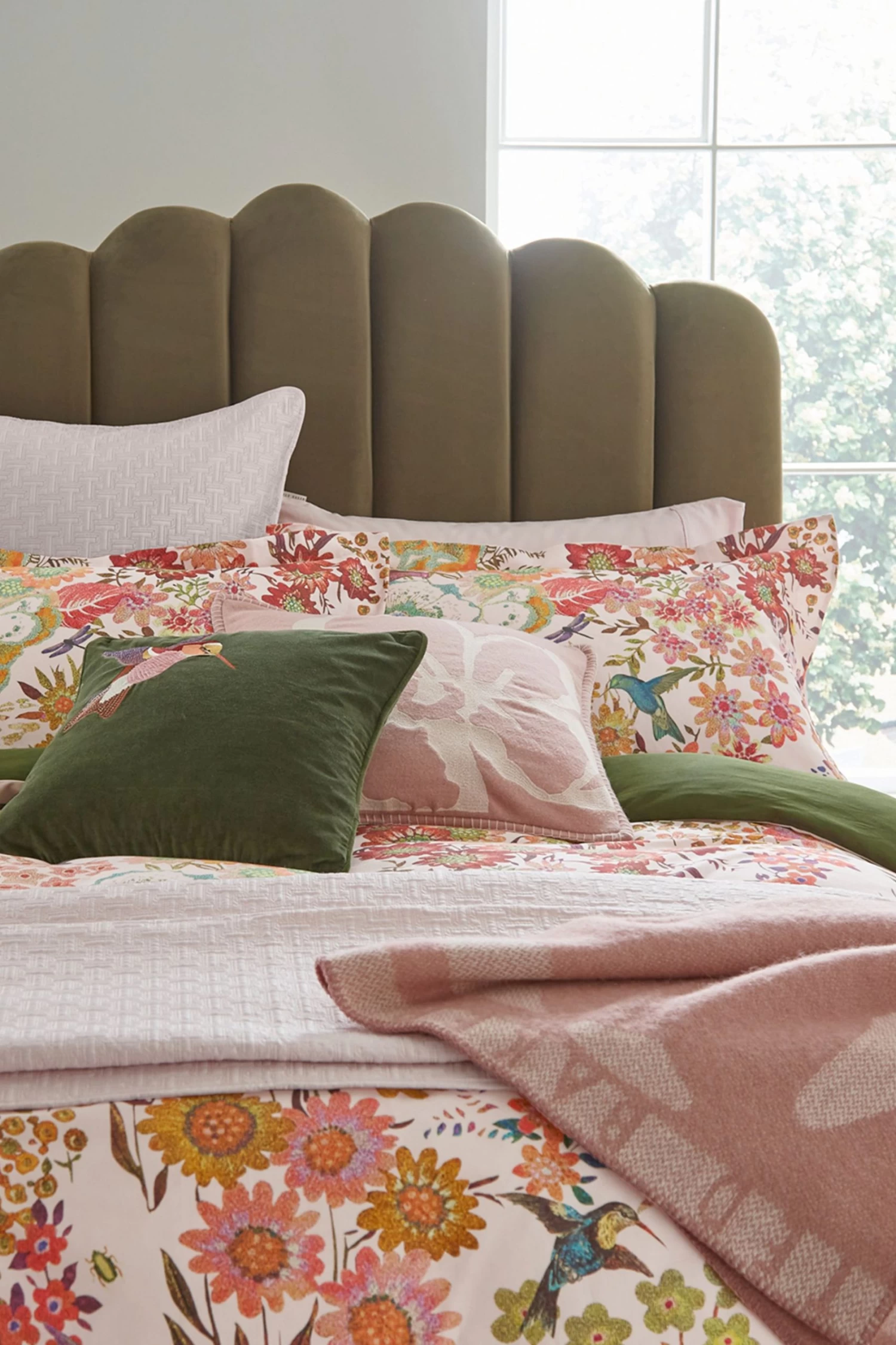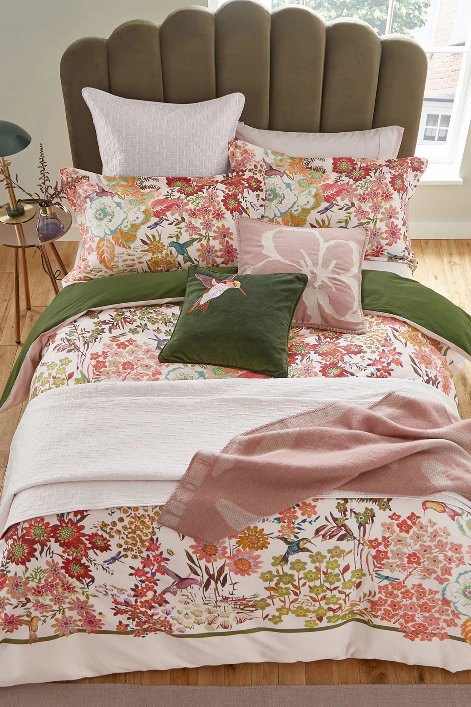 A stunning printed design of multi coloured florals and little hummingbirds come together on a soft pink base framed within a green border.