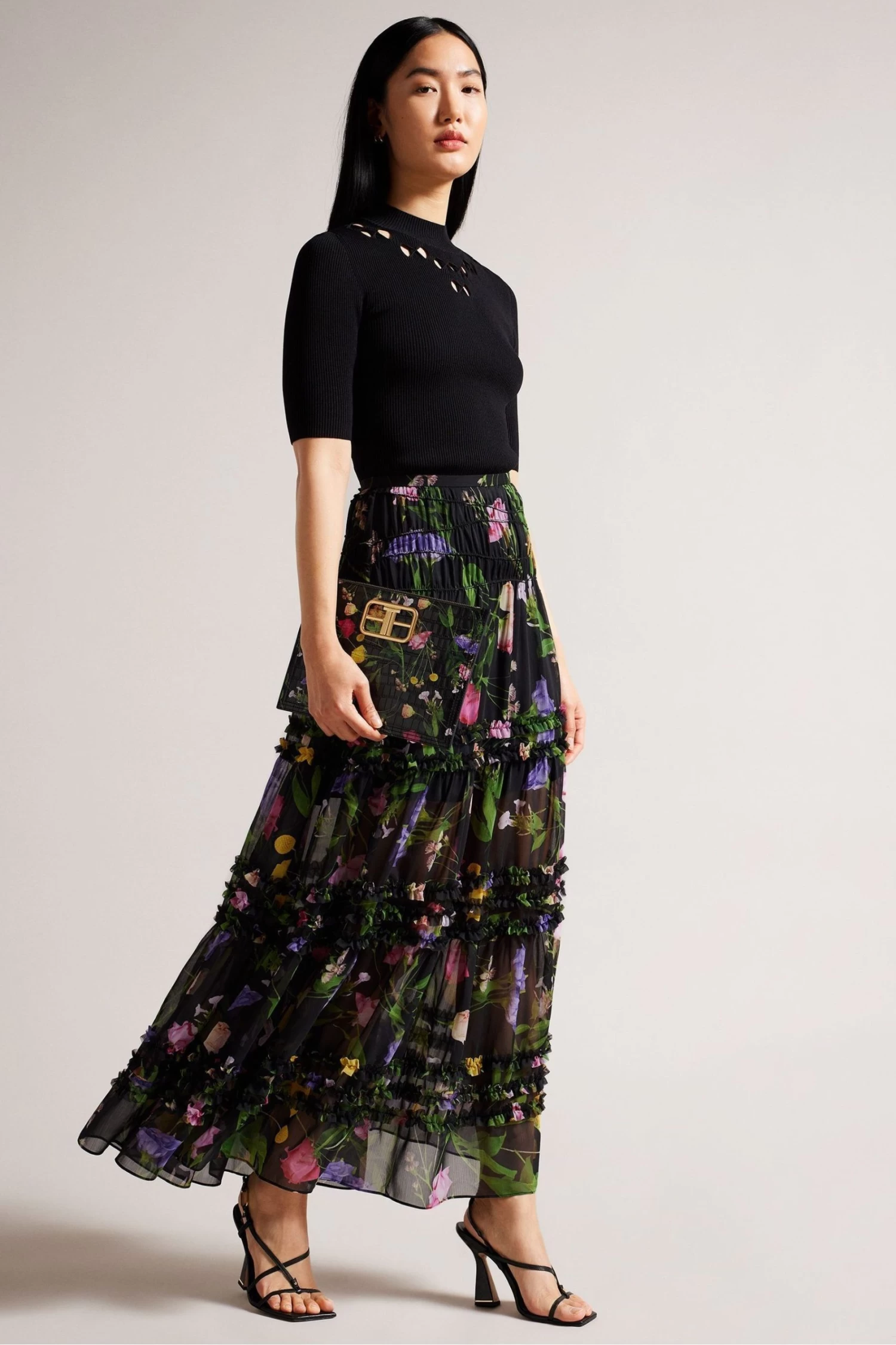 Ted Baker Thieaa Micro Ruffle Tiered Black Midaxi Skirt
